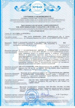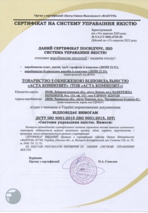 Для нашої компанії забезпечення якості продукції, яка виробляється є пріорітетним на всіх стадіях підприємства. Система якості підприємства сертифікована за стандартом ISO 9001 -2015, що демонструє нашу сильну орієнтацію на клієнта, мотивацію і значимість вищого керівництва, процесний підхід і постійне вдосконалення.